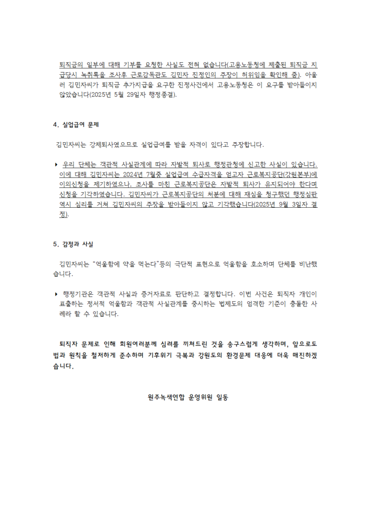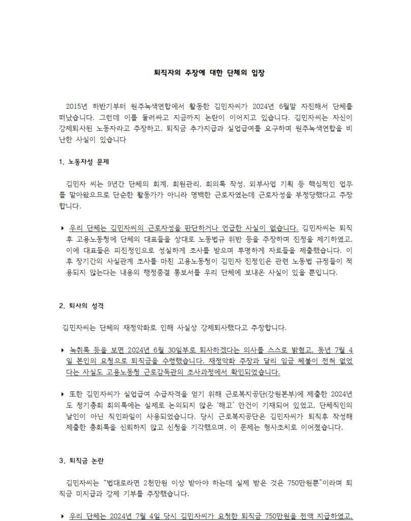 퇴직자의 주장에 대한 단체의 입장